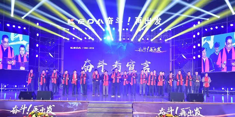1992年,一群奮斗者創辦科達,歷經26年的風雨洗禮,在“求真務實、踏實苦干”、“財散人聚、財聚人散”的精神號召下,凝聚了一大批志同道合的有志之士,助推企業一步一個腳印發展至今,26年后的今天,科達憑借著一代代奮斗者們銳意創新、拼搏進取的精神,從一個名不見經傳的五金小作坊成長為建材機械行業龍頭企業,從中國走向世界!為了更好地支持“全球化”戰略大布局,再攀高峰,公司需要更多科達人投身到奮斗的洪流中,加入奮斗者行列,傳承科達的奮斗精神,以奮斗點燃事業,揚帆再出發!為隆重其事,在兩臺晚會現場特別設置了“奮斗者宣言”誓師儀式,公司所有高管及各事業部、子公司、支持服務平臺等中高層骨干代表團隊及全體員工方陣分別進行“奮斗者宣言”誓師。